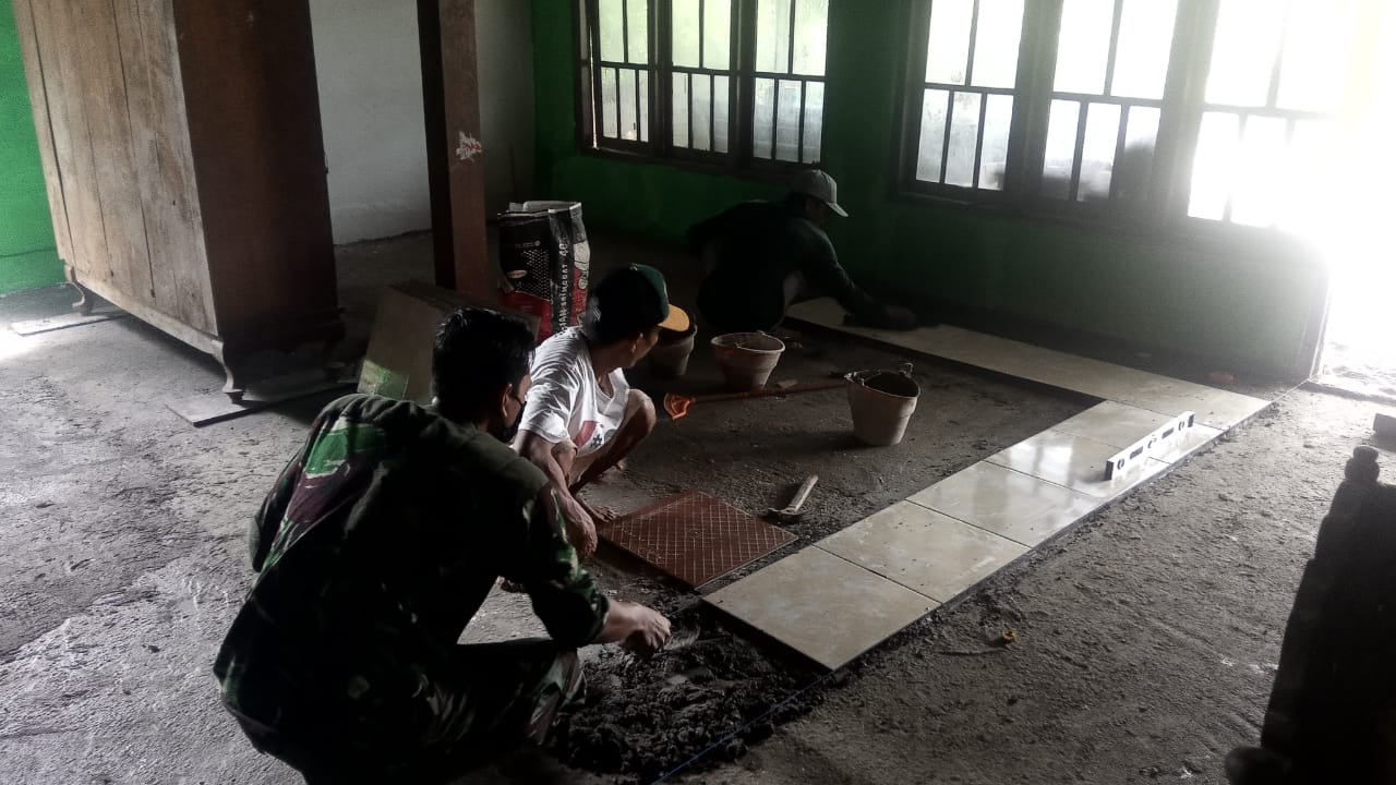 Para anggota TNI Manunggal Membangun Desa, (TMMD) ke-110 bantu memasang keramik untuk rehap rumah warga Desa Ngrancang.