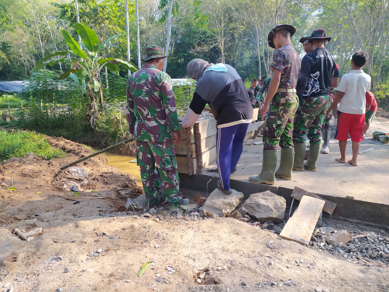 WAY KANAN – Berkat kerja sama antara Anggota Satgas TMMD Ke-111 Kodim 0427/Way Kanan dengan warga Dusun Sidorejo, Kampung Negeri Batin, Kecamatan Umpu Semenguk dalam pelaksanaan pembangunan gorong-gorong type 200, tahap pengecoran sudah selesai, semennya sudah kering sehingga papan yang digunakan untuk pengecoran mulai dibongkar. Selasa (06/07/21).