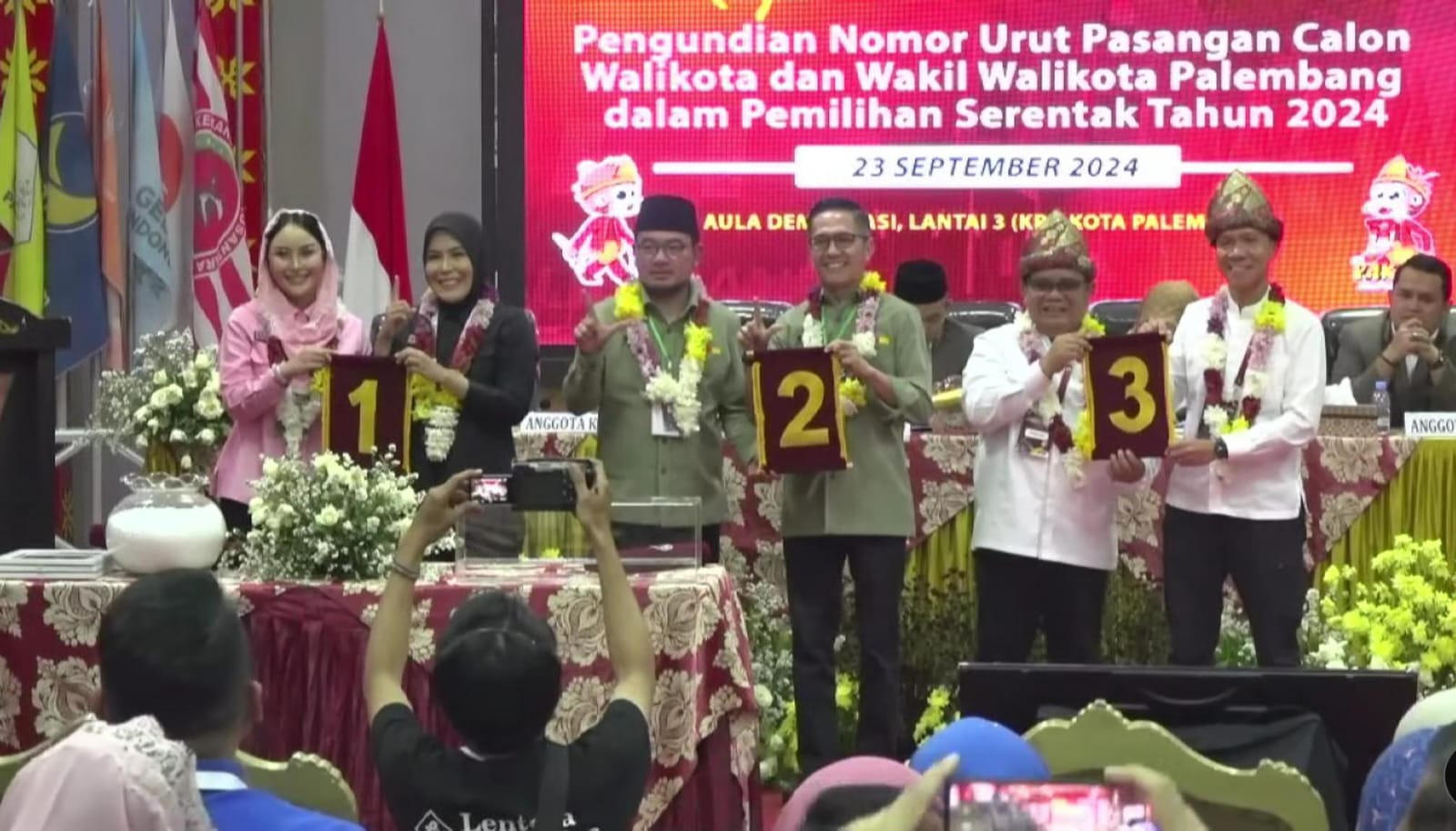Kliksumatera.com, PALEMBANG- Komisi Pemilihan Umum (KPU) Kota Palembang hari ini, Senin (23/9/2024) menggelar penentuan No Urut bagi pasangan Calon Walikota dan Calon Wakil Walikota Palembang periode 2025 – 2030.