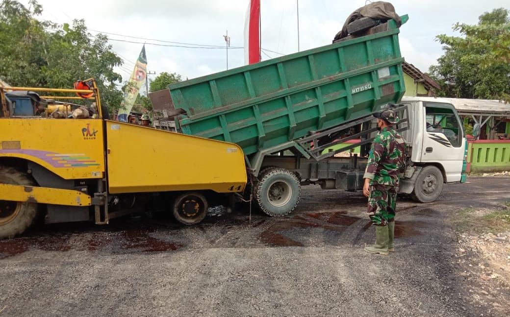 Letda Lek Slamet Nursamsi, secara langsung memberikan aba aba dan mengarahkan armada truk yang akan melakukan bongkar aspal ke dalam alat berat untuk di ratakan di jalan Desa Ngrancang yang menjadi sasaran program jalan aspal, Sabtu (13/03/2021).