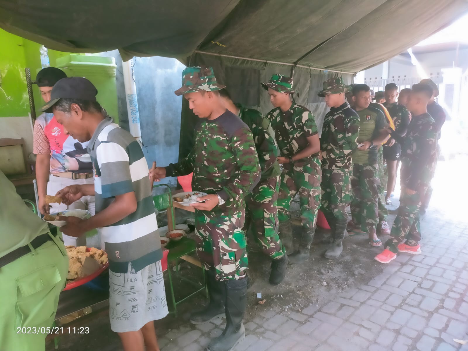 Surakarta – Budaya antri, ternyata juga diterapkan dalam mengambil makan siang oleh Satgas TMMD Reguler ke-116 Kodim 0735/Surakarta bersama dengan warga masyarakat yang saat ini sedang menikmati makan siang bersama, bertempat di tenda Dapur Umum Satgas TMMD, Kp.Balong Baru, Kelurahan Banjarsari, Kecamatan Banjarsari, Minggu (21/03/2023).