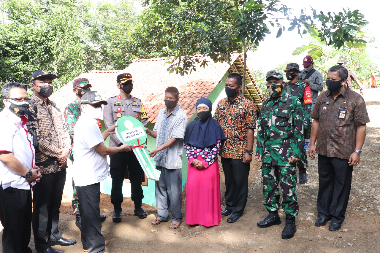 Banjarnegara – Bupati Banjarnegara Budi Sarwono menyerahkan kunci rumah RTLH Program Tentara Manunggal Membangun Desa (TMMD) Reg 111 TA 2021. Kodim 0704/Banjarnegara (14/7) telah selesai desa Kebutuhjurang Kecamatan Pagedongan Kabupaten Banjarnegara, Jawa Tengah. Jumat (16/7/21).