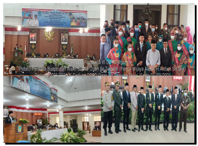 Kliksumatera.com, INDRALAYA- Bupati Ogan Ilir Panca Wijaya Akbar SH dan Wakil Bupati Ogan Ilir H Ardani SH MH segera melaksanakan janji kampanyenya guna mewujudkan Ogan Ilir Bangkit, Menuju Kejayaan Masyarakat yang Sejahtera. Hal tersebut disampaikan Bupati Ogan Ilir dalam pidato perdananya pada rapat Paripurna VI DPRD Ogan Ilir di Gedung DPRD OI yang dibuka dan ditutup oleh Ketua DPRD Ogan Ilir, Suharto SH yang dihadiri Wakil Gubernur Sumsel Ir H Mawardi Yahya, unsur Forkopimda OI, Ketua dan wakil ketua serta anggota DPRD OI, Plt Sekda OI dan seluruh OPD OI, para camat dan Kades se-Ogan Ilir, Ketua Tim Penggerak PKK OI serta seluruh stakeholder dan masyarakat serta tamu lainnya, Senin (01/03/2021) lalu.
