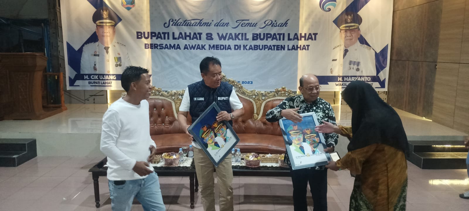 Di ujung acara, Persatuan Wartawan Indonesia (PWI) Kabupaten Lahat memberikan Cinderamata berupa foto untuk Bupati Lahat H. Cik Ujang SH – Wabup Lahat H. Haryanto SE, MM.