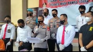 Kliksumatera.com, MURATARA- Rigen alias Igen (35) warga Desa Maur Lama Kecamatan Rupit, Kabupaten Musi Rawas Utara Provinsi Sumatera Selatan, tersangka pelaku pembunuhan terhadap Herlan Erpandi Alias Arpan (39) warga Desa Maur Lama pada Rabu (17/02/2021) yang lalu, sekira pukul 03.00 Wib, tertunduk lesu saat dihadirkan dalam gelar Pers Rillis oleh Polres Musi Rawas Utara.