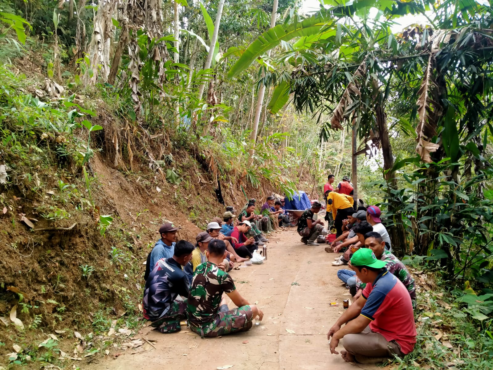 Di sela-sela aktivitas pengerjaan di sasaran fisik ,TMMD yang diselenggarakan oleh Kodim 0708/Purworejo, di mana Satgas dan warga jalin keakraban sambil istirahat di lokasi sasaran.