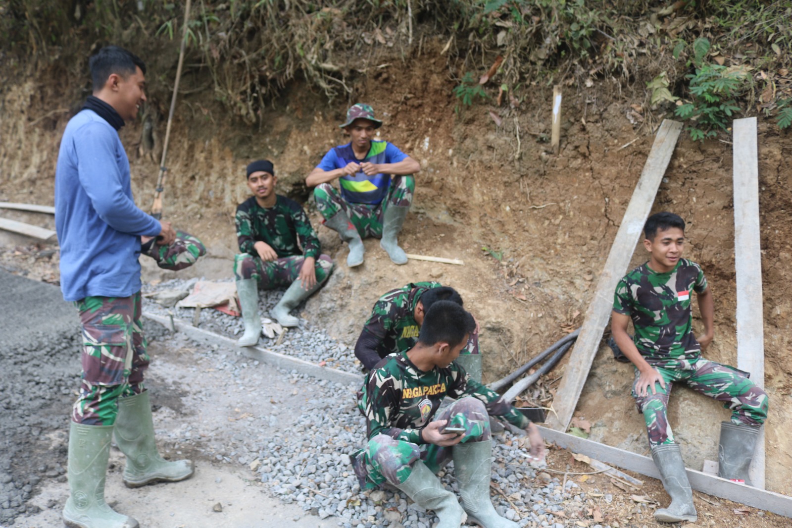 Ketika tiba waktu istirahat, maka itu sangat di manfaatkan oleh anggota satgas TMMD untuk melepas lelah. Di sela sela waktu istirahat mereka saling bercanda tawa, untuk menghilangkan rasa lelah, Rabu (11/10/2023).