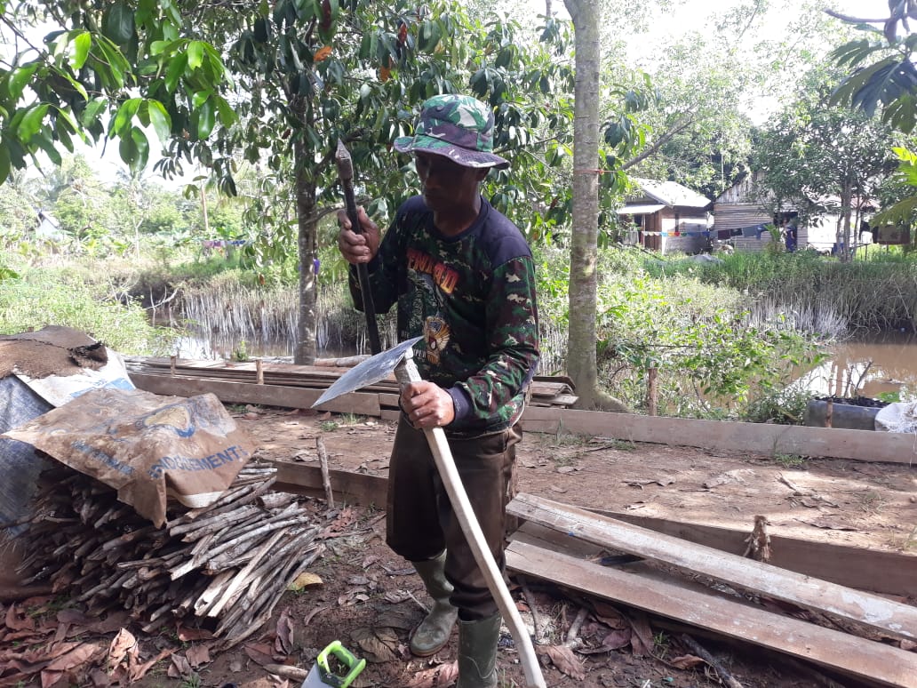 Kapuas,- Serda Jabir harus berjibaku memperbaiki gagang cangkul miliknya yang rusak karena akan digunakan untuk membuat lubang jamban warga. Menurut Serda Jabir jika semenjak dibukanya TMMD ke-110, di Desa Saka Lagun, Kecamatan Pulau Petak, kabupaten Kapuas, satgas TMMD terus berupaya bekerja semaksimal mungkin, agar TMMD tersebut bisa sukses, sehinggga membawa banyak manfaat ke warga Desa.