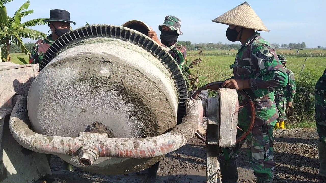 anggota satgas tmmd reguler ke – 111 bersama Masyarakat warga Desa Tamansari,Kecamatan Jaken, Kabupaten Pati, berbaur untuk membuat jalan pengecoran jalan penghubung antar desa yakni Desa Tamansari, menuju Desa Sumberarum, Para warga bahu membahu mendorong angkong yang berisi campuran untuk pengecoran.