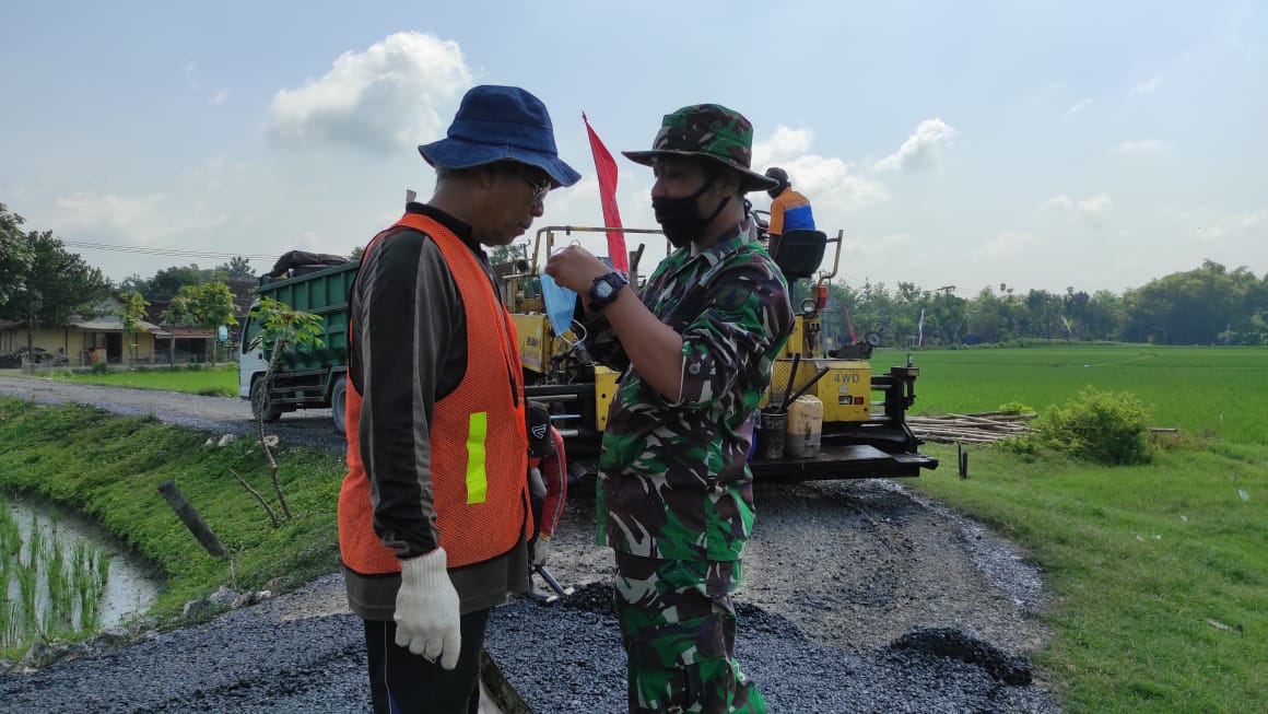 “Pembagian masker ini sebagai salah satu upaya kita bersama melindungi masyarakat dari penularan COVID-19, Kata Serda Dwi Permono Sudi salah satu Satgas TMMD ke-110 di lokasi pengaspalan, Kamis(4/3/2021).