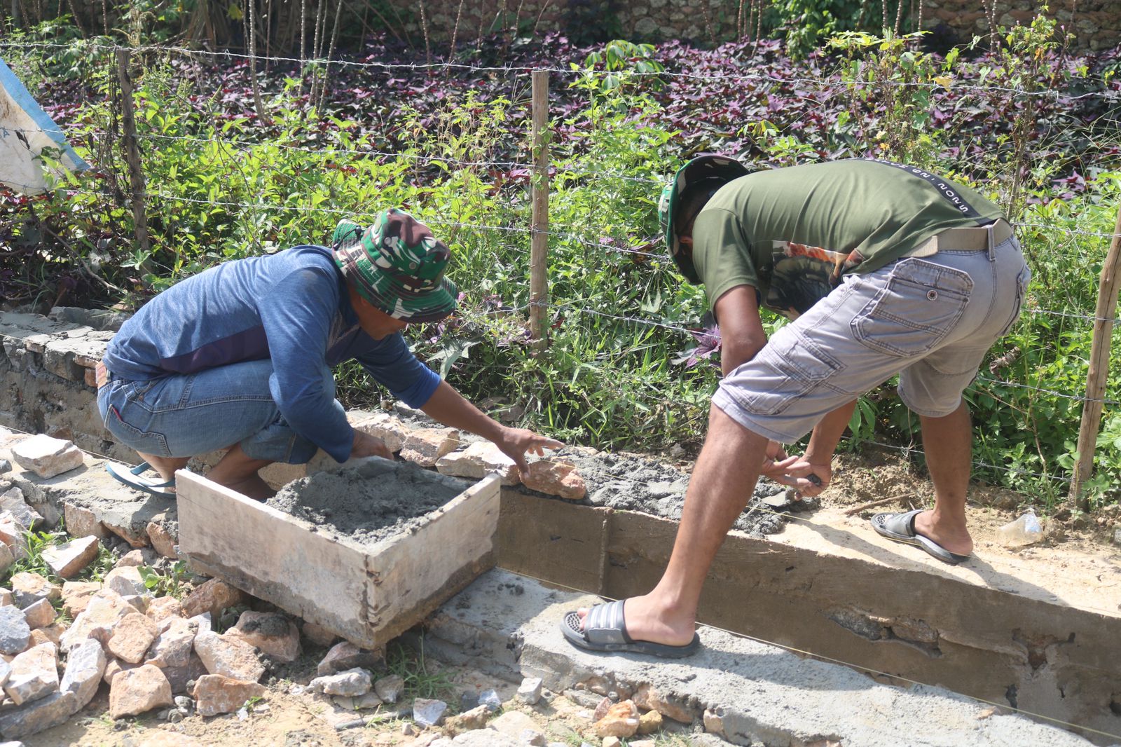 Dalam aksi gotong royong tersebut, prajurit TNI bersama warga setempat terlihat sigap menyusun material batu gunung dan semen untuk menambah ketinggian dinding saluran air di sisi jalan.