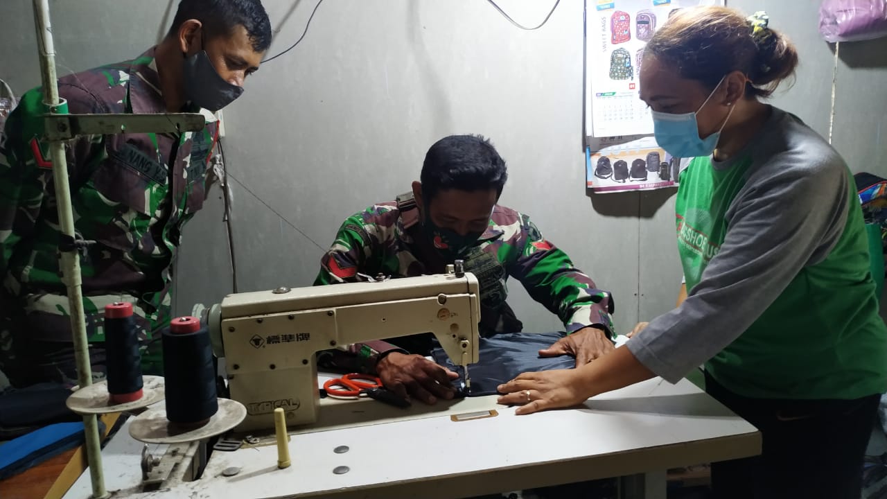 Berawal dari situ kemudian Satgas TMMD Kodim 0813/Bojonegoro belajar menjahit tas. Dalam belajar menjahit itu juga dilakukan sosialisasi terkait dengan pelaksanaan program TMMD 110 di daerahnya. (Pendim 0813)