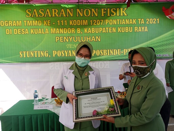Ketua Persit cabang LI mengatakan pemberian plakat ini merupakan apresiasi kepada tim pemateri (Dr. Yessy FS, SP., DV.) yang berkenan menyisihkan waktu untuk memberikan penyuluhan kepada warga Desa Kuala Mandor B, dan juga sebagai bentuk kepedulian terhadap pemenuhan gizi dan nutrisi pada balita.