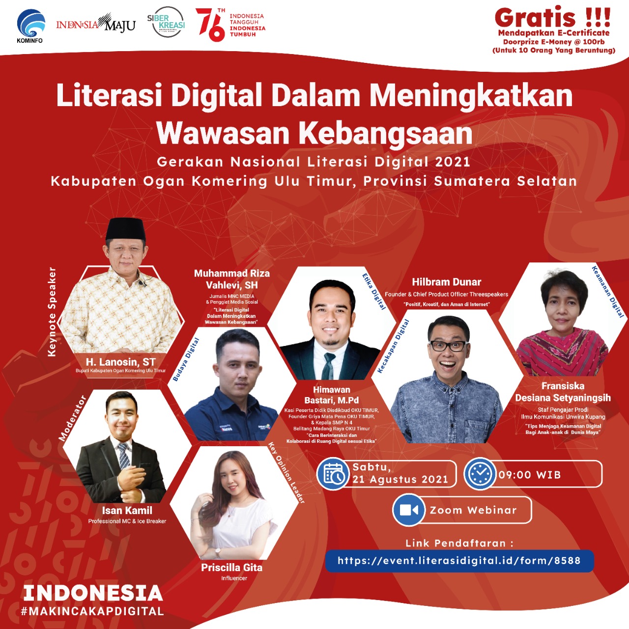 Sebagai Keynote Speaker adalah Bupati Ogan Komering Ulu Timur yaitu, H. Lanosin, S.T., dan Bp. Presiden RI Bapak Jokowi memberikan sambutan pula dalam mendukung Literasi Digital Kominfo 2021.