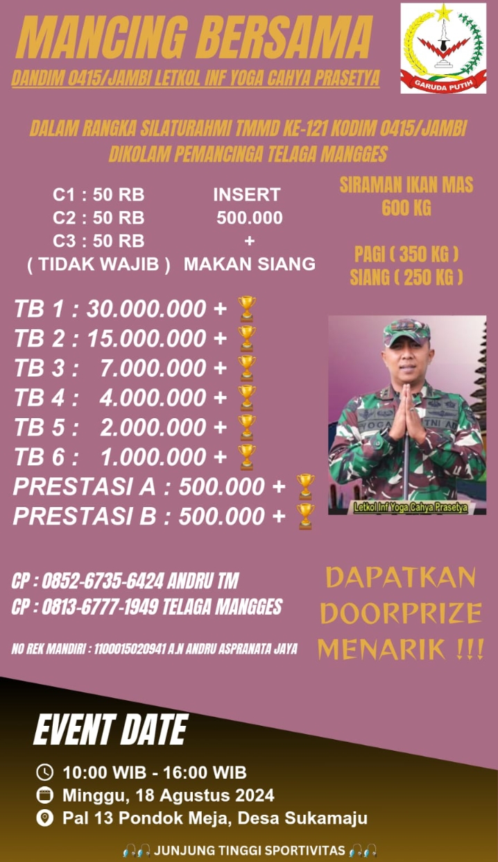 Mancing bersama Dandim 0415/Jambi yang juga Dansatgas TMMD ke 121 Kodim Jambi tersebut akan digelar pada Minggu, 18 Agustus 2024 di Paal 13, Pondok Meja, Desa Sukamaju sebelum lokasi TMMD diadakan.