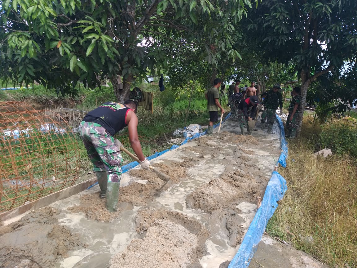Kekompakan personel Satgas TMMD bersama warga terlihat saat bergotongroyong mengecor jalan usaha tani yang harus segera diselesaikan sesuai target waktu yang sudah ditentukan komando atas.