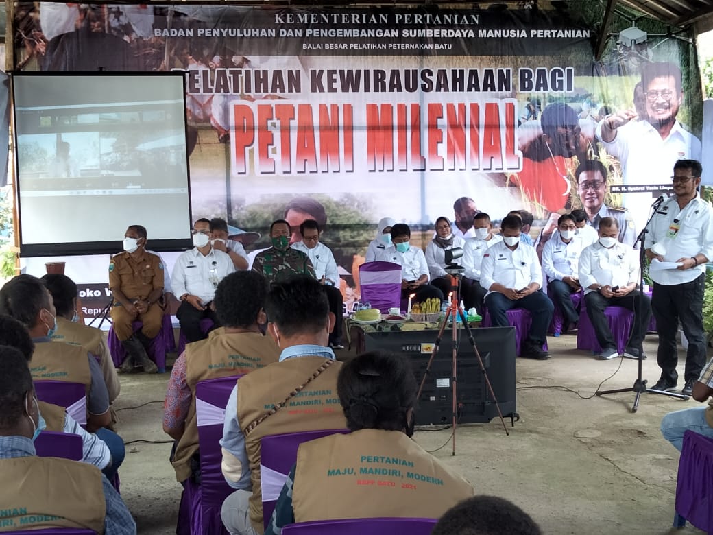 Sorong Papua Barat. Selasa (05/10/2021),- Komandan Kodim 1802/Sorong Letkol Inf Budiman SE.M.I.Pol. MM di wakili oleh Danramil 1802 – 07 /Aimas Kapten Inf. Harfin menghadiri kegiatan pembukaan Pelatiha Kewira Usahaan Bagi petani Melenial oleh Dr. H.Syahrul Yasin Linpo S.H., M.H (Menteri Pertanian RI), bertempat di Bendungan SP 1, Kelurahan Klamalu , Distrik Mariat Kabupaten Sorong Prov. Papua Barat.