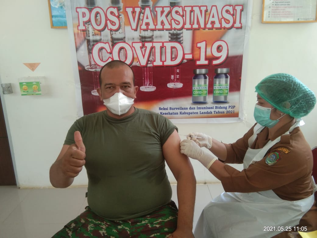 Landak – Sebanyak 15 lansia bersama 45 petugas pelayanan publik termasuk Danramil dan Babinsa Koramil 1201-12/Air Besar menjalani vaksinasi Covid-19 dosis pertama di Aula Puskesmas Serimbu, Kabupaten Landak, Selasa (25/5/2021)