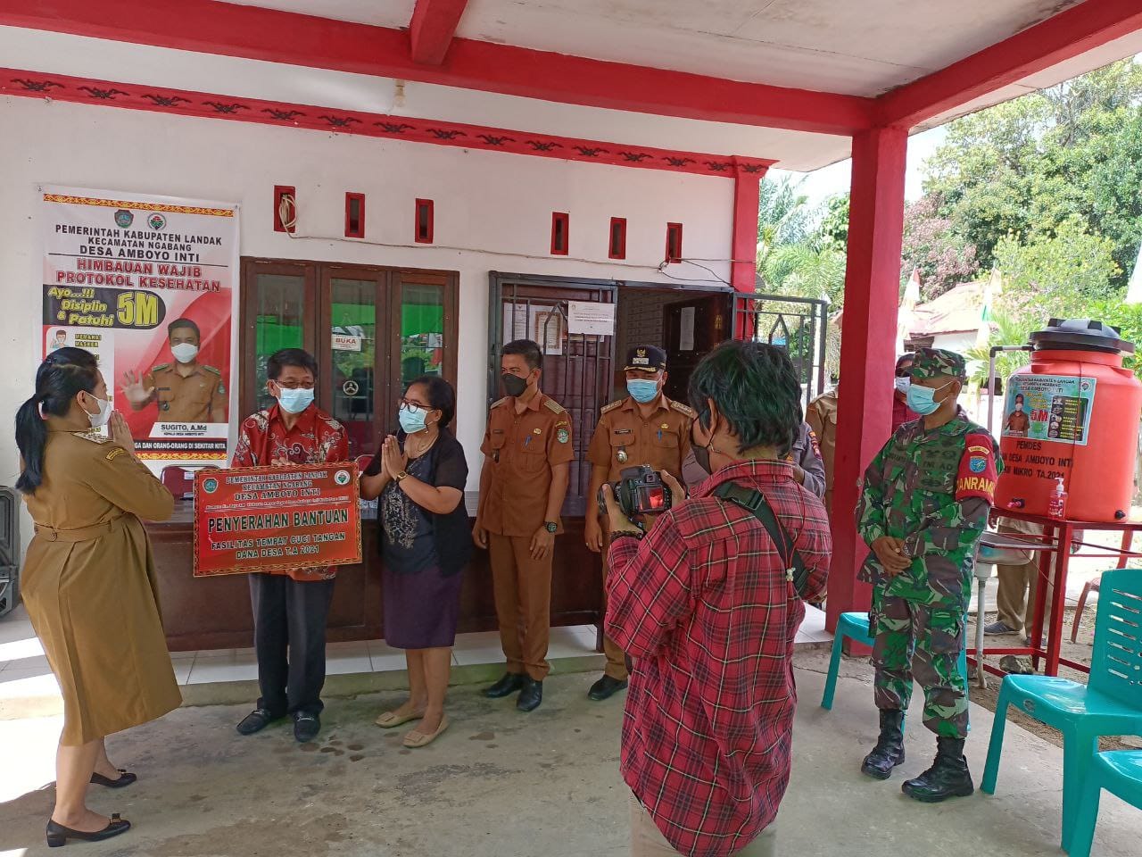 Landak – Danramil 1201-11/Ngabang Kapten Inf. Bambang Rusdianto mendampingi Bupati Landak, Karolin Margret Natasa menyerahkan Bantuan Penanggulangan Bencana Non Alam Covid-19 berupa empat cuci tangan untuk warga Desa Amboyo Inti, Kecamatan Ngabang, Kabupaten Landak, Selasa (8/6/2021).