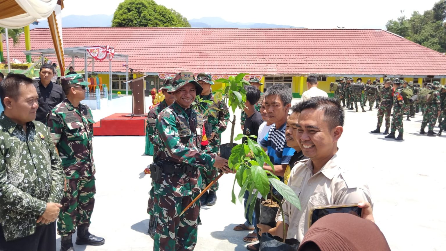 EMPAT LAWANG – Komandan Satuan Tugas (Dansatgas) Tentara Nasional Indonesia (TNI) Manunggal Masuk Desa (TMMD) ke 122 Kodim 0405/Lahat, Letkol Inf Asis Kamaruddin SE MIP menyerahkan secara simbolis Bibit buahan kepada warga Desa Lampar Baru, Kecamatan Talang Padang, Kabupaten Empat Lawang.