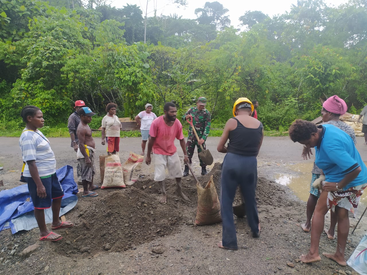 “Setelah istirahat sebagian masyarakat mengambil material pasir untuk di bawa ke Distrik Wemak Lokasi TMMD Ke-110, kami terapkan sistem gotong royong dengan cara ini akan semakin cepat dan mudah”