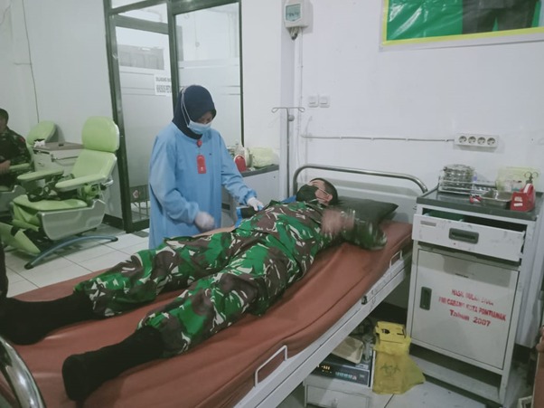 Pontianak – Disela-sela kesibukan mensukseskan program TMMD ke-111 Kodim 1207 Pontianak di Kabupaten Kubu Raya, Dansatgas TMMD ke-111 Kodin 1207 Pontianak Kolonel Inf Jajang Kurniawan, S.IP,M.M., bersama sejumlah anggota satgas TMMD meluangkan waktunya untuk memberikan donor darah bagi sesama yang berlokasi di PMI Jl. Jendral Ahmad Yani, Kelurahan Benua Melayu Darat, Kecamatan Pontianak Selatan, Kota Pontianak, Senin (05/07/2021).
