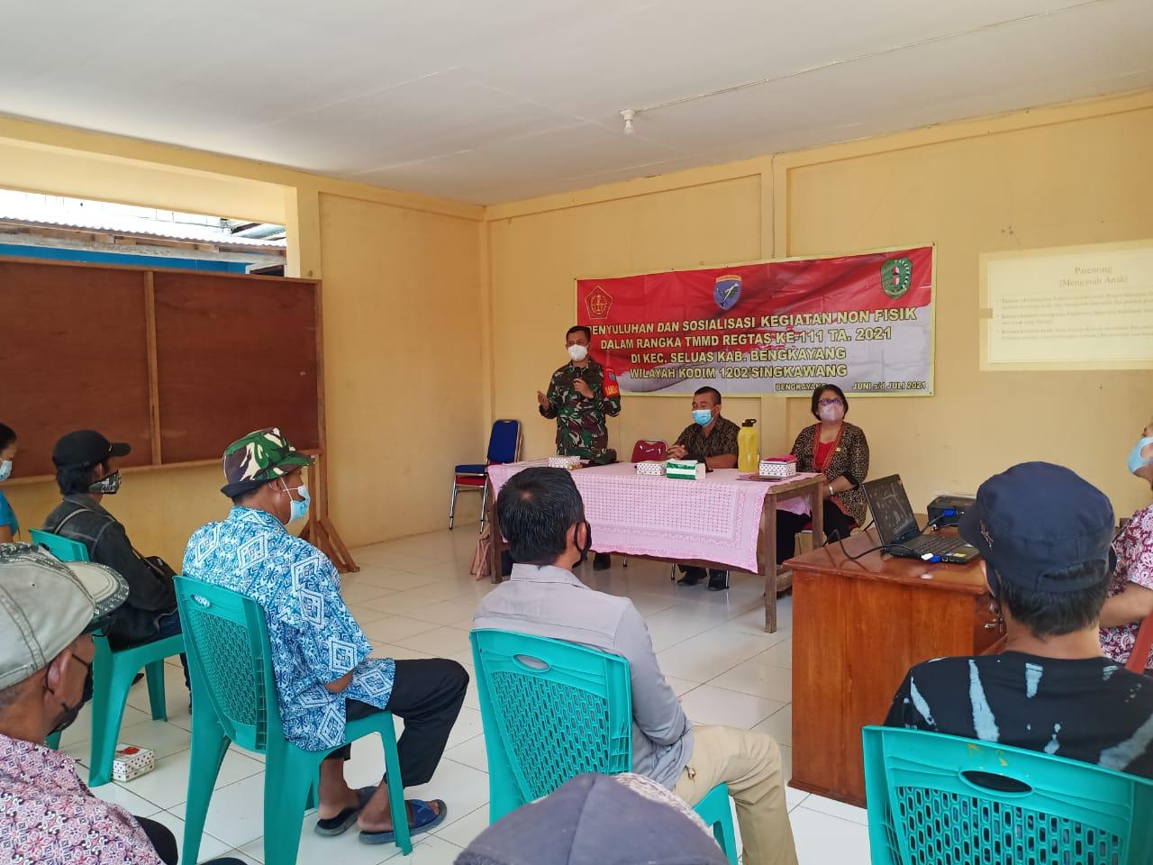 Bengkayang – Keberadaan Satgas TMMD Regtas ke 111 Kodim 1202/Skw di tengah-tengah masyarakat adalah dalam rangka membantu Pemerintah Daerah dalam upaya meningkatkan kesejahteraan masyarakat, di mana keberadaannya selain mengerjakan kegiatan fisik, Satgas TMMD juga melaksanakan kegiatan non fisik berupa sosialisasi dan penyuluhan kesehatan.