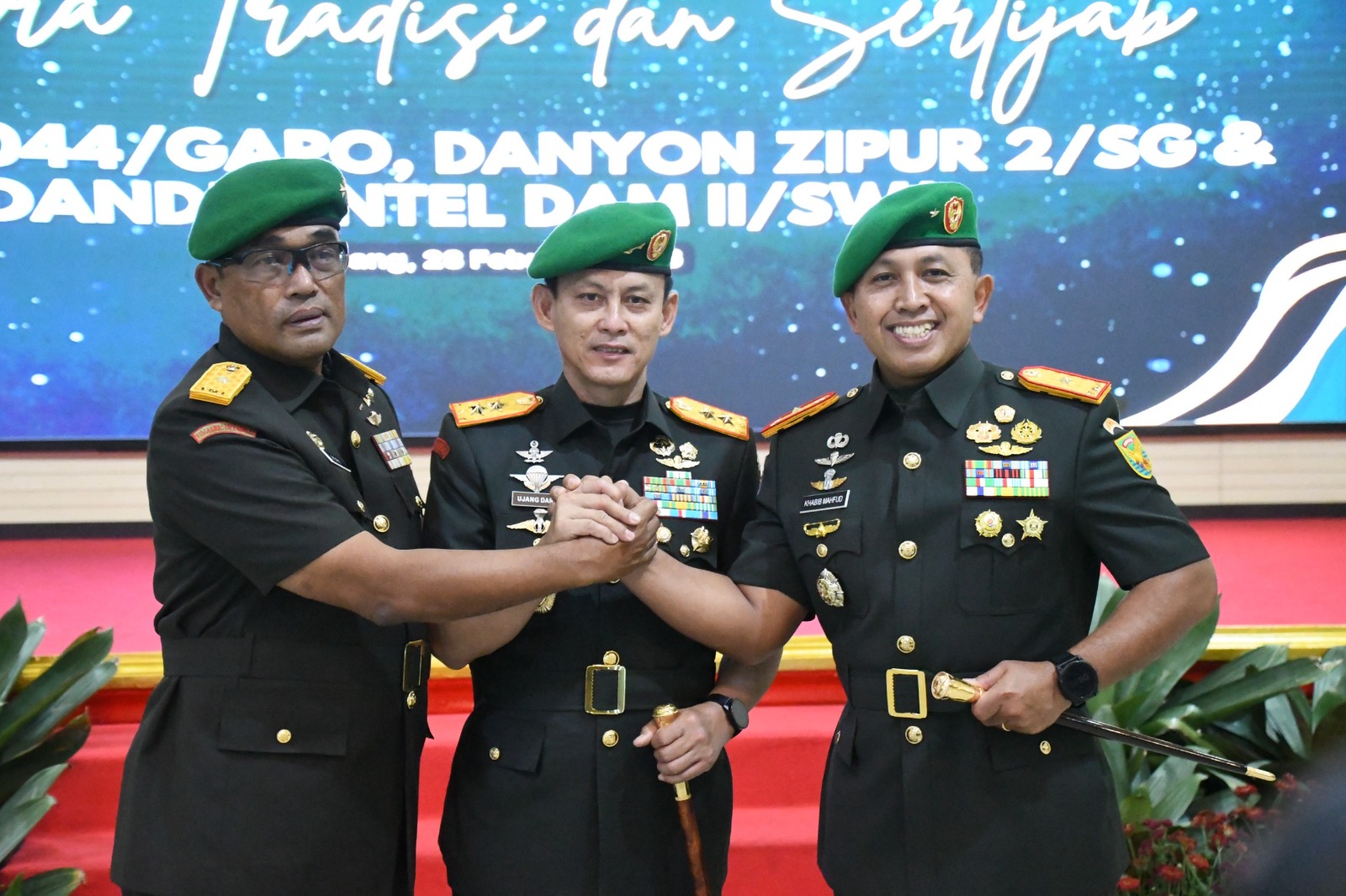 Selain Sertijab Danrem 044/Gapo, dalam kesempatan yang sama juga dilaksanakan serah terima jabatan Komandan Batalyon Zeni Tempur 2/SG serta Komandan Detasemen Intelijen Kodam II/Swj. Rangkaian kegiatan ini menjadi momentum penting dalam menjaga kesinambungan kepemimpinan dan soliditas satuan.