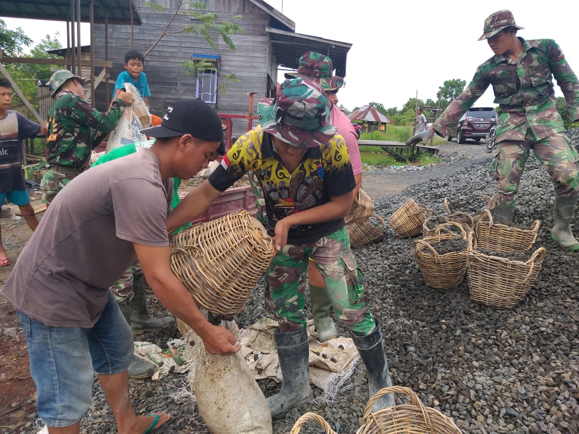 Kapuas,- Pengerjaan Sasaran fisik Program TNI Manunggal Membangun Desa (TMMD) Reguler ke -110, Kodim 1011/KLK di Desa Saka Lagun, Kecamatan Pulau Petak, Kabupaten Kapuas, terus dimaksimalkan. Anggota satgas TMMD bersama warga, bahu membahu mengumpulkan material kerikil dengan menggunakan alat seadanya, yang selanjutnya dibawa menuju lokasi pembangunan, Minggu (21/3/2021).