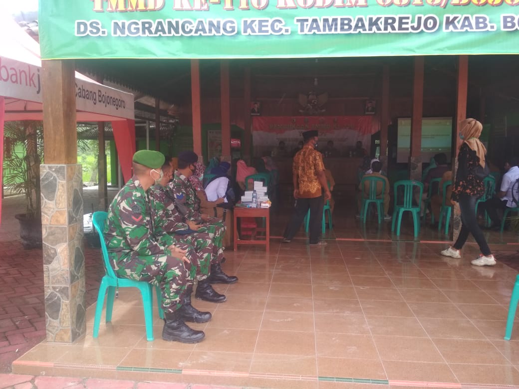 Bojonegoro – Anggota Satgas TNI Manunggal Membangun Desa (TMMD) ikut kegiatan sosialisasi yang di laksanakan DP3AKB Kecamatan Tambakrejo di Balaidesa Ngrancang, Kamis (11/3/2021).