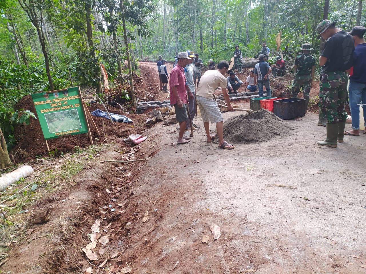 WAY KANAN – Anggota Satgas TMMD ke-111 Kodim 0427/Way Kanan, bersama masyarakat Kampung Negeri Batin melaksanakan pembangunan gorong gorong di Dusun IV KM 20/2 Kampung Negeri Batin Kecamatan Umpu Semenguk Kabupaten Way Kanan, Senin (21/6/2021)
