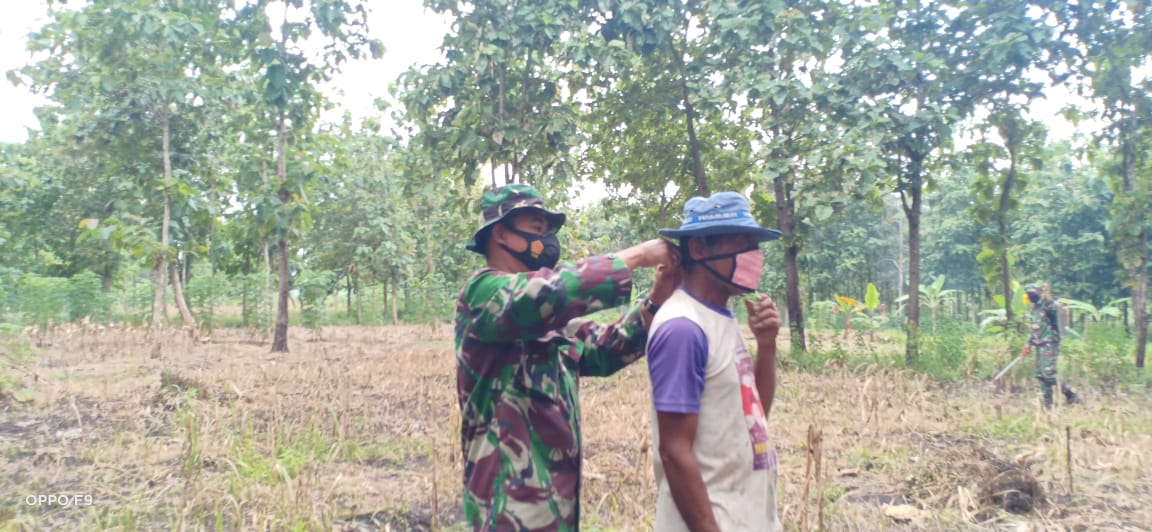 Bojonegoro – Seorang petani yang sedang berada di sawah dan diketahui tidak menggunakan masker, kemudian salah satu personil Satgas TMMD ke-110 di Desa Jatimulyo, Kecamatan Tambakrejo, Kabupaten Bojonegoro ini mendatanginya dan menberikan sebuah masker untuk di gunakan.