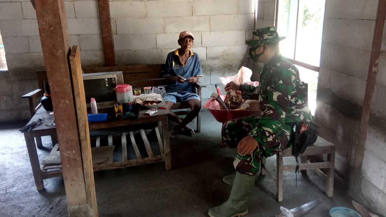 Bojonegoro- Anggota Satgas TMMD ke-110 Serda Lajahidin bersama Bapak Lamin penerima program RTLH TMMD ke-110 senang rumahnya hampir selesai. Hal tersebut dikatakan oleh penerima saat istirahat.