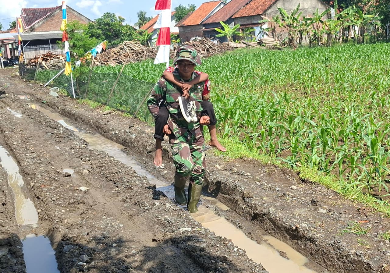BREBES – Sebuah aksi humanis terekam di tengah pelaksanaan TNI Manunggal Membangun Desa (TMMD) Reguler ke-127 Kodim 0713/Brebes. Serda Nanang, terlihat menggendong anak-anak sekolah dasar saat melewati akses jalan yang becek dan berlumpur menuju sekolah, Senin (16/02/2026).
