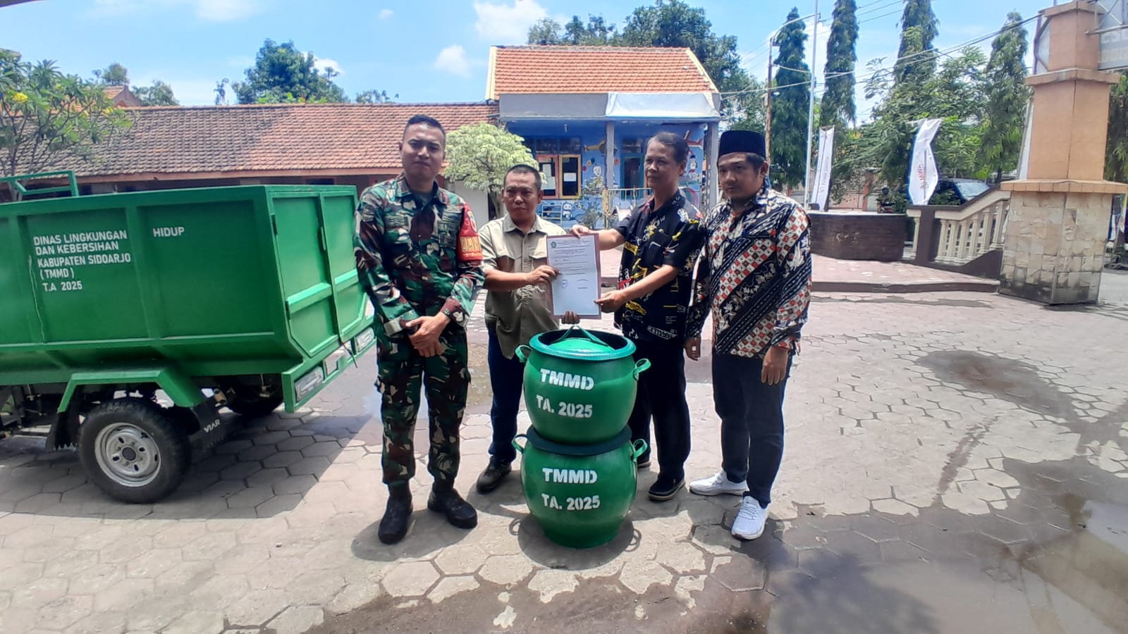 Sidoarjo – Sebagai bentuk dukungan nyata terhadap keberlanjutan Program TNI Manunggal Membangun Desa (TMMD) ke-126 Kodim 0816/Sidoarjo, Dinas Lingkungan Hidup dan Kebersihan (DLHK) Kabupaten Sidoarjo menyerahkan bantuan kendaraan roda tiga pengangkut sampah dan tempat sampah kepada masyarakat Desa Kedondong, Kecamatan Tulangan, Kabupaten Sidoarjo. Selasa, 28 Oktober 2025.