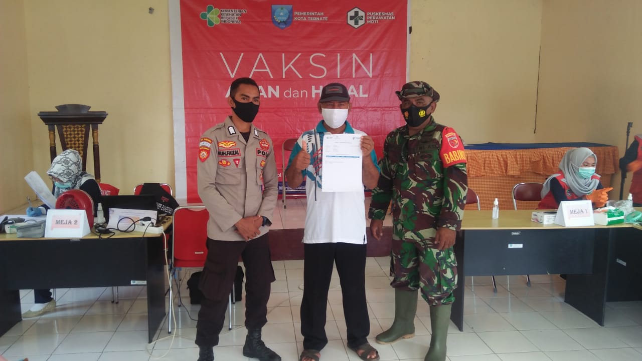 Didampingi oleh bhabinkamtibmas dan Babinsa Seorang warga di Kepulauan Moti mengambil dokumentasi untuk memastikan kepada seluruh warga di Kepulauan Moti bahwa vaksinisasi itu aman dan tidak berbahaya.