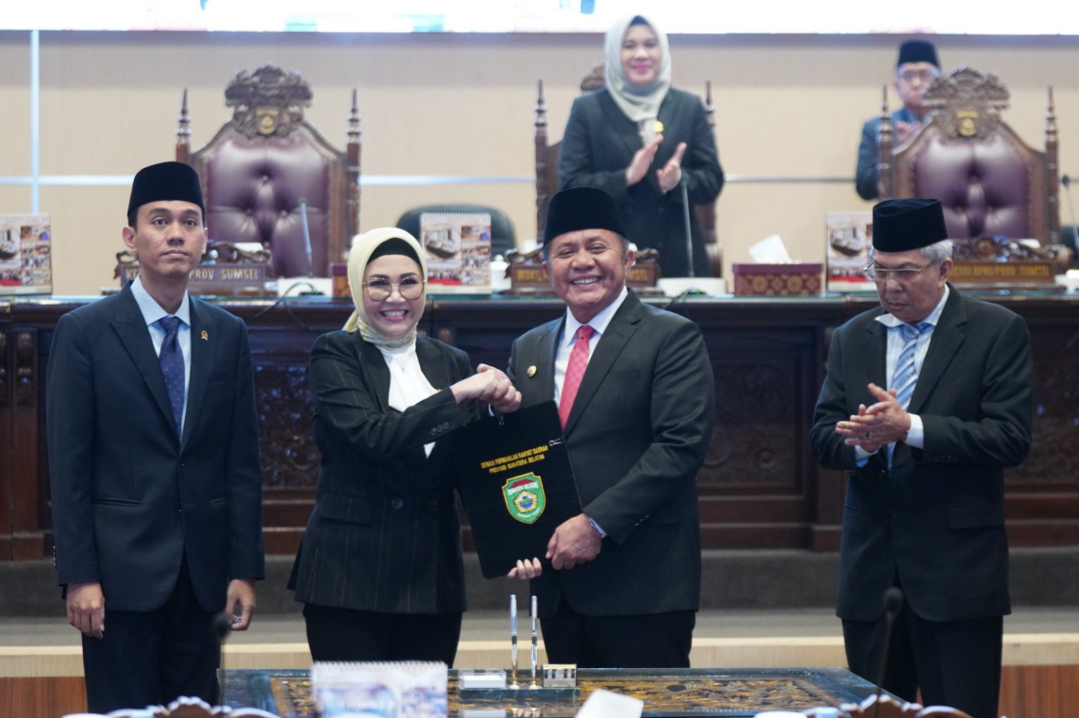 Setelah Pembacaan Laporan Hasil Pembahasan Banggar terhadap Raperda dimaksud, dan secara Aklamasi Peserta Rapat Paripurna menyetujui, selanjutnya dilakukan prosesi penandatanganan keputusan Bersama antara eksekutif dan legislative terhadap Raperda APBD TA 2024 yang rancangan Keputusannya telah dibacakan oleh Sekretaris DPRD Prov. Sumsel ; H. Aprizal, S.Ag, SE, M.Si.