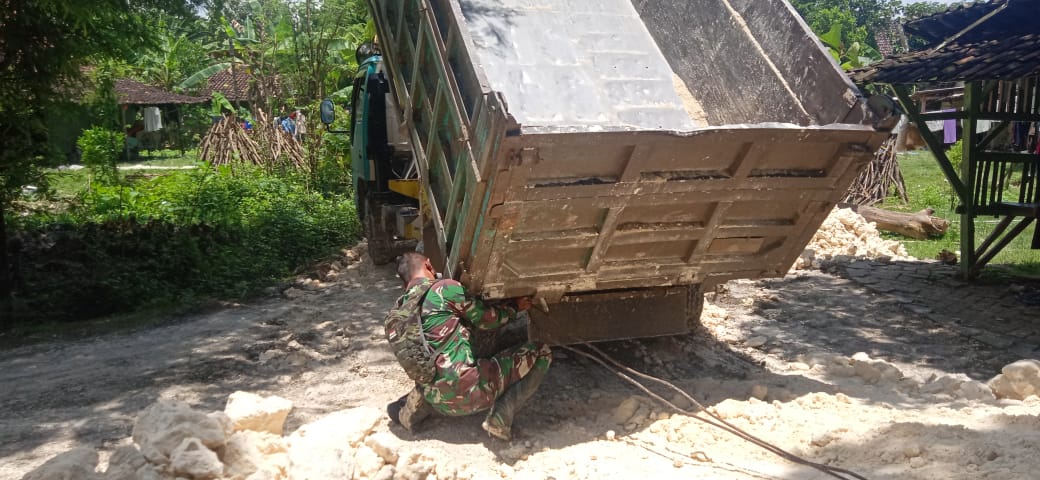 Siang ini kegiatan sedikit terganggu, sebuah Damtruck pengangkut pasir untuk material pembangunan tersebut mengalami patah roda as belakang. Dengan sigap Satgas TMMD membantu melakukan penderekan kendaraan agar segera bisa diperbaiki.