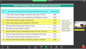 “Pembelajaran IPA masa kini dan masa depan sudah seharusnya menjadi pembelajaran yang adaptif dan efektif, karena Pembelajaran yang adaptif yang dapat berlangsung di berbagai situasi atau lingkungan belajar baik secara luring ataupun daring,” jelasnya.