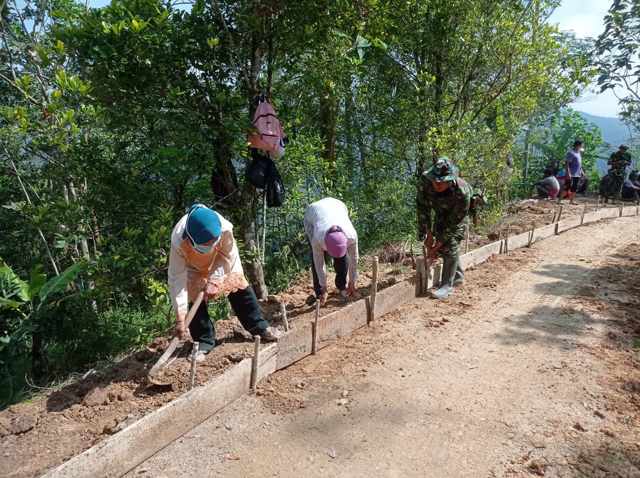 Banjarnegara – Tidak mau ketinggalan Emak Emak di Desa Kebutuhjurang Kecamatan Pagedongan Kabupaten Banjarnegara Jawa Tengah, juga ikut pengecoran jalan dan pemasangan Bekisting Program TMMD Reguler ke-111 Kodim 0704/ Banjarnegara, Salmiah (35) bersama warga bergotong royong bersama Satgas TMMD. Senin (28/6/21).