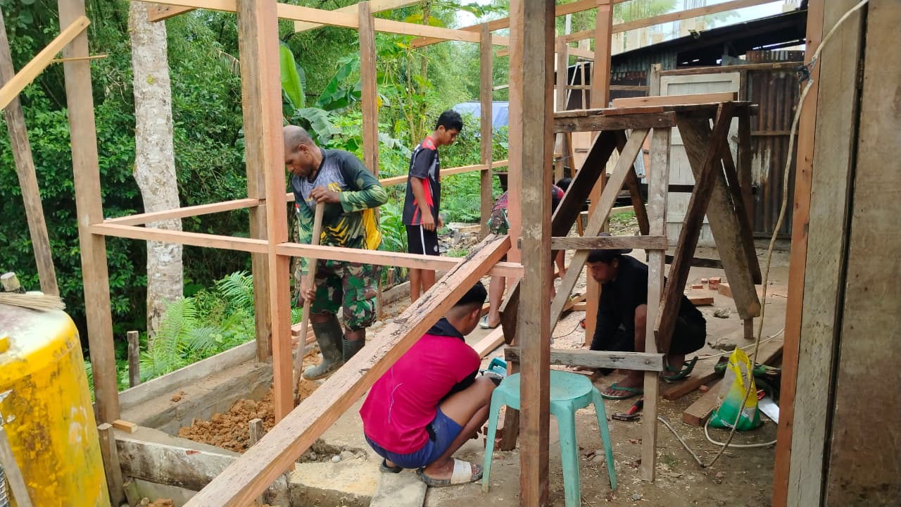 BOVEN DIGOEL – Satuan Tugas (Satgas) TNI Manunggal Membangun Desa (TMMD) ke-126 Kodim 1711/BVD terus memprioritaskan peningkatan fasilitas dasar masyarakat Kampung Waropko. Saat ini, pembangunan fasilitas Mandi, Cuci, Kakus (MCK) yang kelima telah memasuki tahap krusial, yaitu pembuatan rangka bangunan.