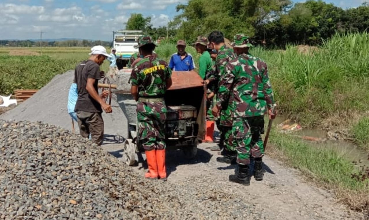 Terlihat di sasaran pokok betonisasi peralatan molen siap operasional dengan operator para anggota TNI yang ditugaskan membantu masyarakat untuk membangun jalan penghubung desa Tamansari dengan desa Sumberarum.