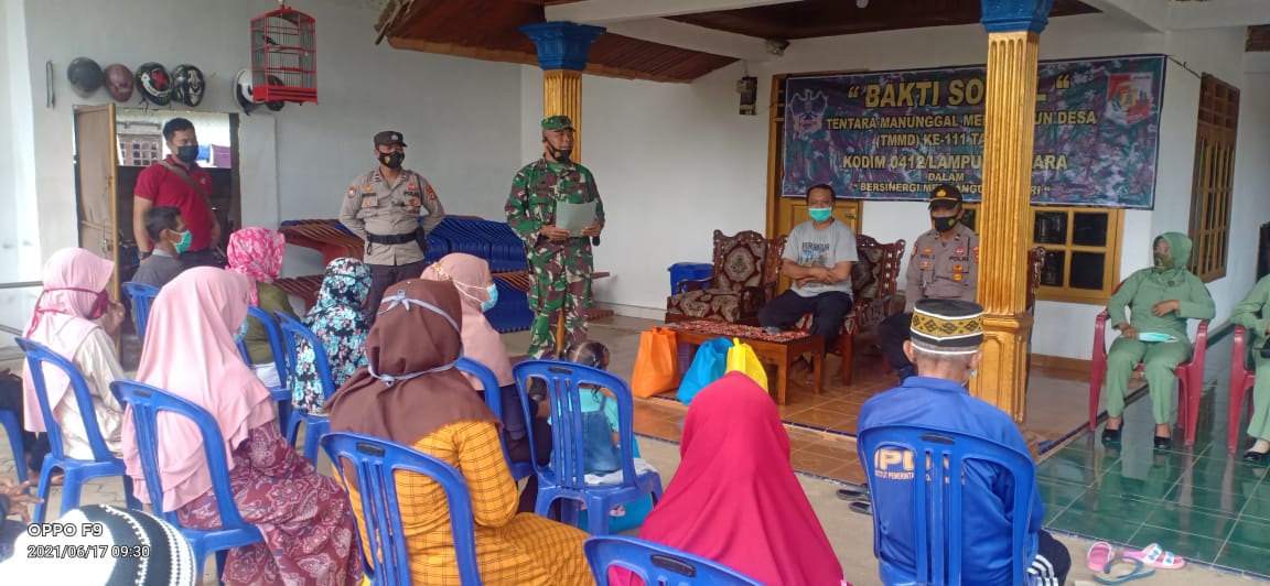 Lampung Utara – Menyikapi perkembangan pandemi virus covid-19 yang berdampak kepada seluruh sendi masyarakat di Kecamatan Abung Jayo Satgas TMMD 111 Kodim 0412/LU berinisiatif menggelar Bakti Sosial, Rabu (16/06/2021).