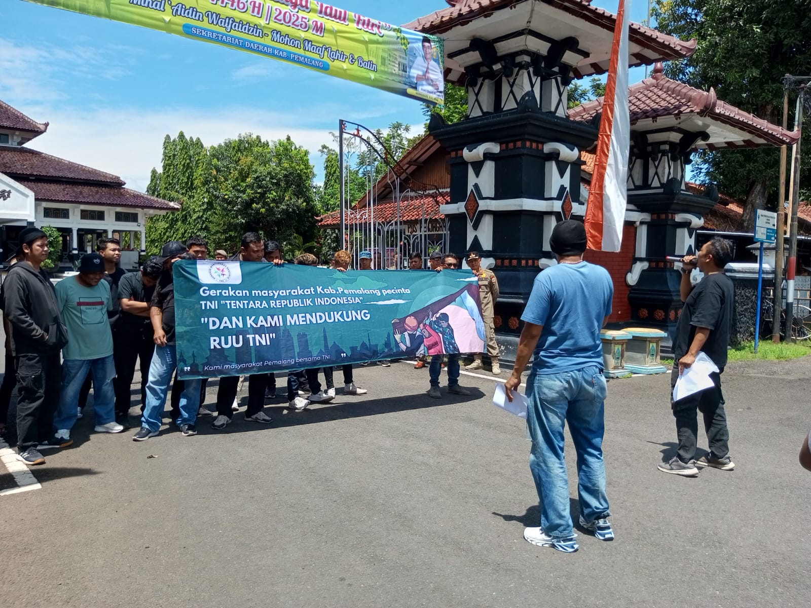 Kliksumatera, Pemalang – Gerakan Masyarakat Pemalang Pencinta TNI (GMPP) dengan koordinator lapangan Triyono dan Wahyu menggelar aksi damai mendukung disahkannya RUU TNI di depan kantor Bupati Pemalang, Sabtu (29/3/25).