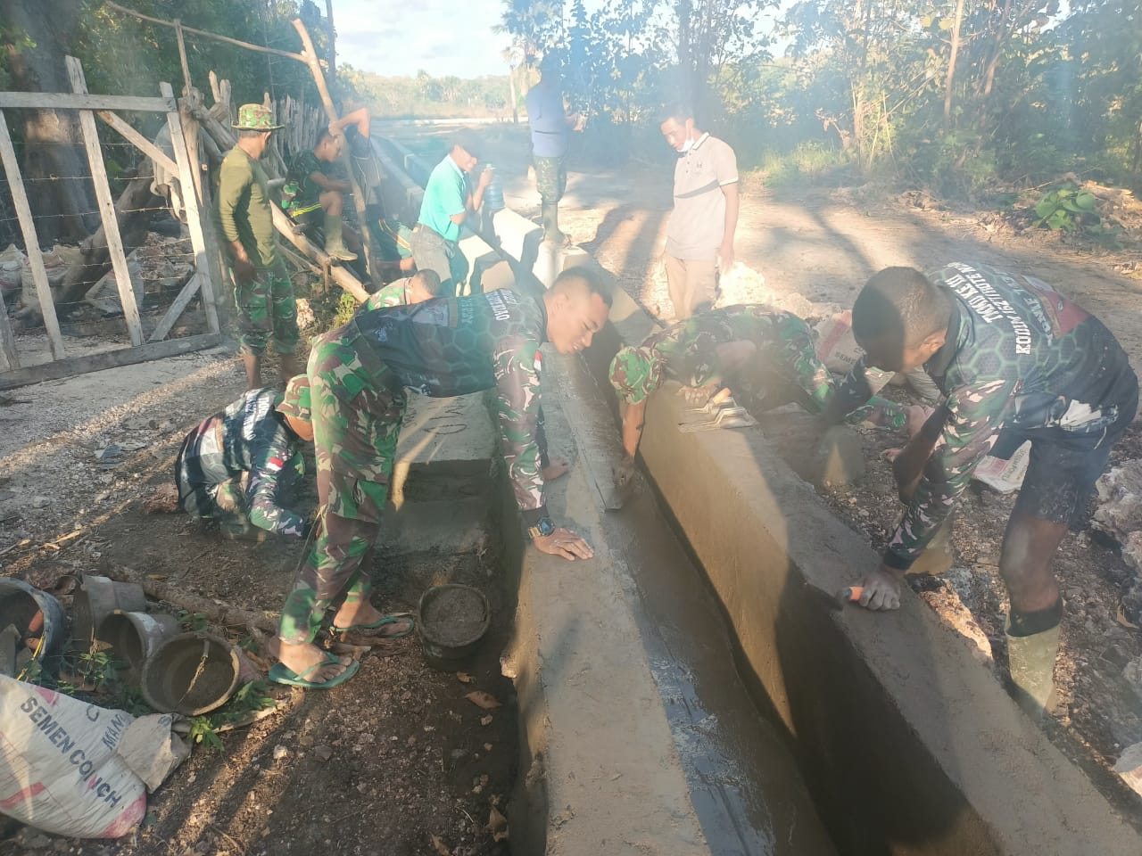 Hal itu terlihat, setelah warga dan anggota satgas bekerja seharian dalam pengerjaan saluran irigasi.