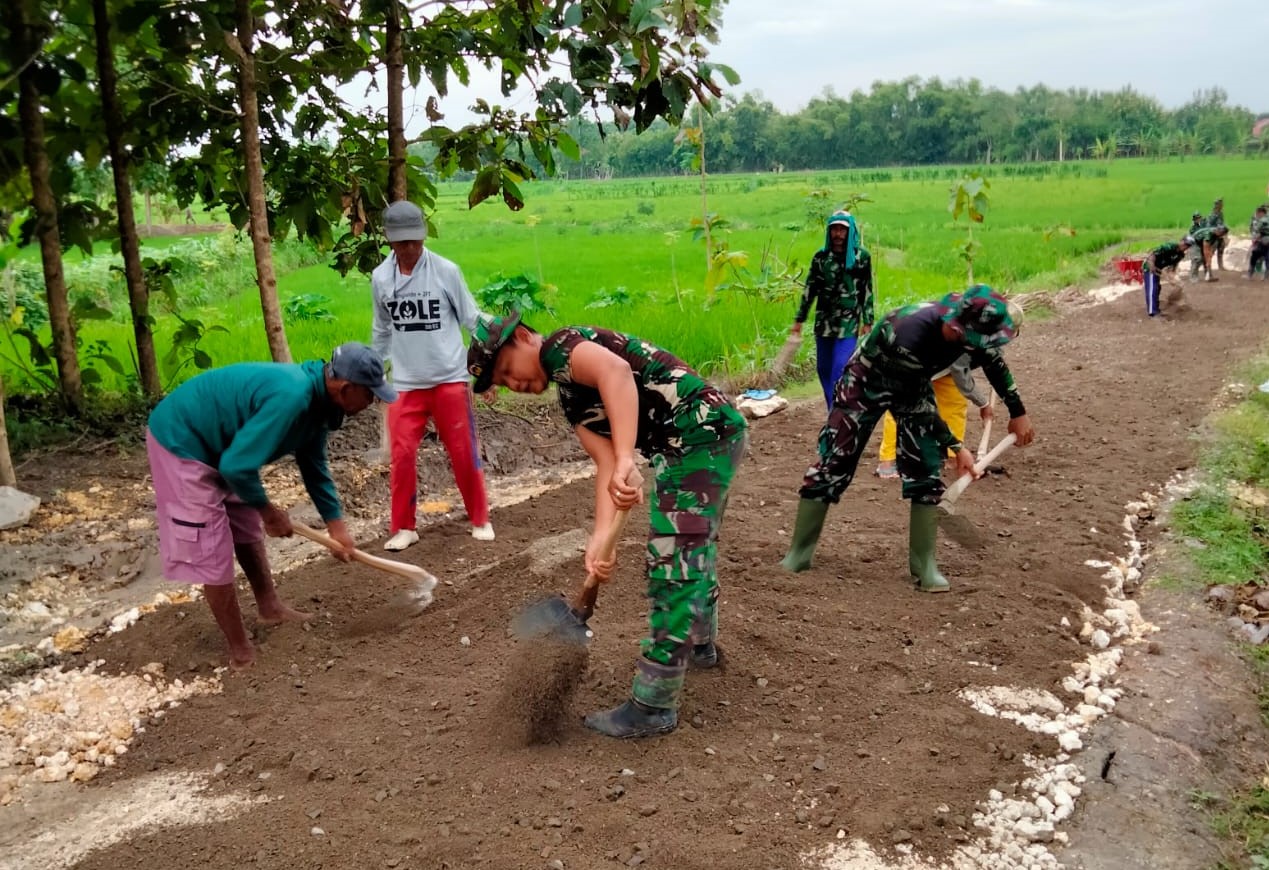 Bojonegoro- Anggota Satgas TMMD Ke-110 Kodim 0813/Bojonegoro, bahu membahu bergotong-royong untuk meratakan tanah urug bersama dengan warga Dusun Kalongan, Desa Jatimulyo, Kecamatan Tambakrejo, Kabupaten Bojonegoro.