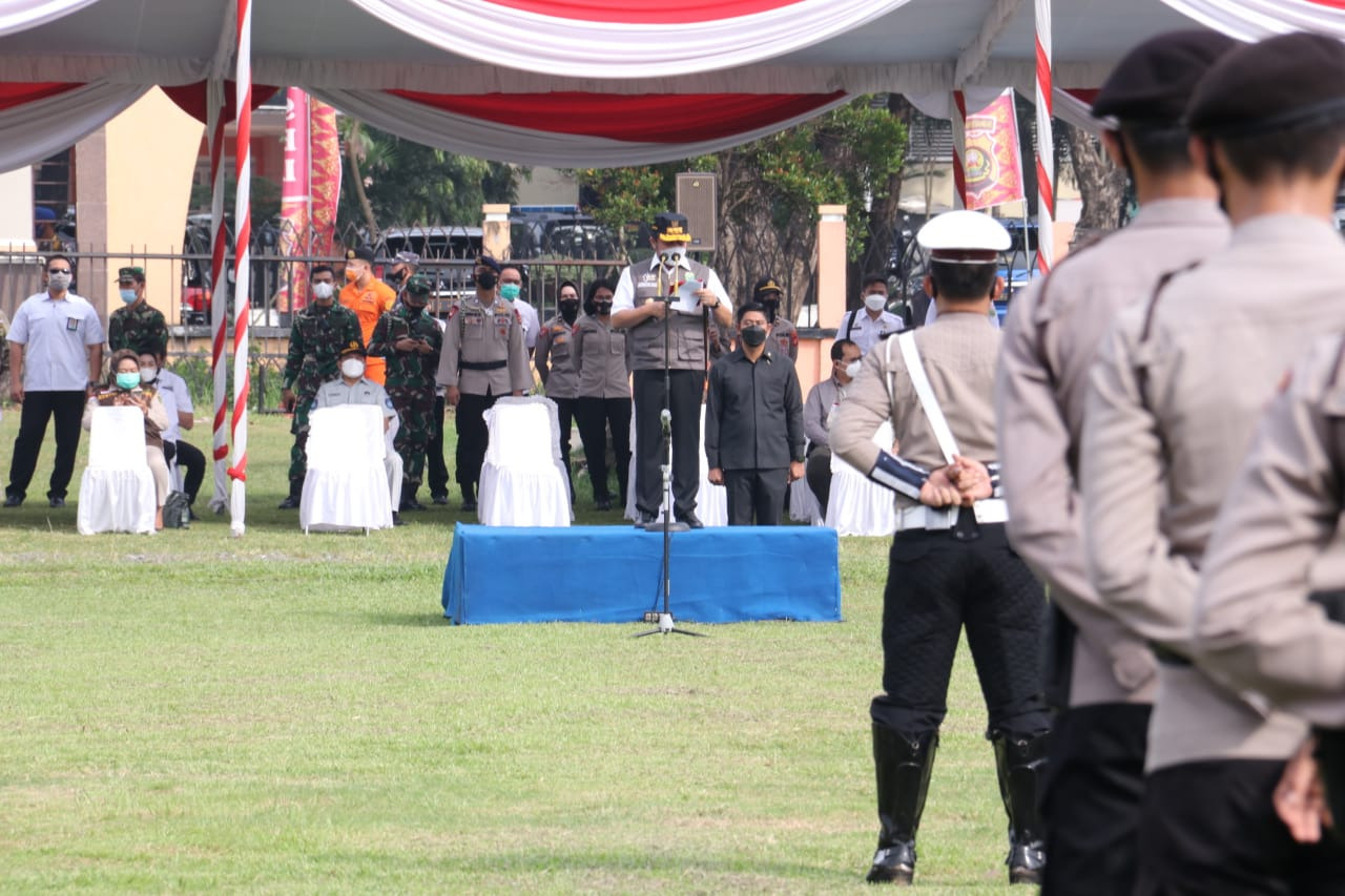 Gubernur Sumsel H Herman Deru, bertindak sebagai inspektur apel di hadapan personel gabungan TNI Polri dan juga unsur terkait, yang ikut dalam apel gelar pasukan operasi Ketupat Musi 2021 ini.