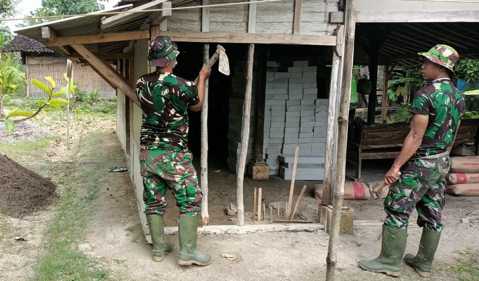 Salah satunya saat melakukan pembongkaran rumah sasaran pembangunan dalam program aladin (atap, lantai dinding). Anggota Satgas memanfaatkan peralatan yang ada untuk membongkar dinding rumah, Sabtu (13/3/2021).