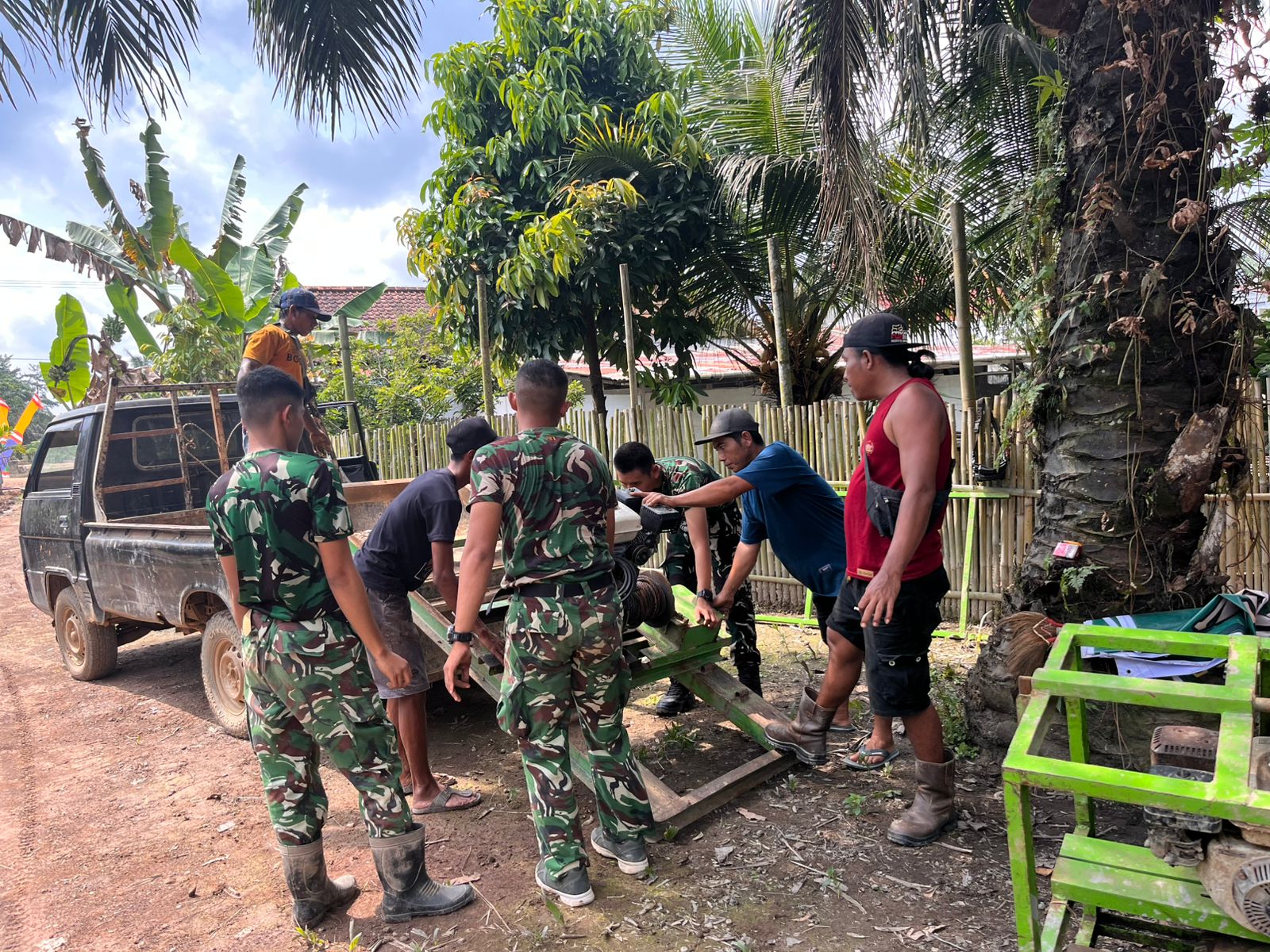 Dengan semangat gotong royong, anggota Satgas TMMD dan masyarakat bahu-membahu mempersiapkan segala keperluan untuk pembangunan sumur bor, mulai dari meratakan tanah, menyiapkan peralatan, hingga memasang banner tanda dimulainya pembangunan.