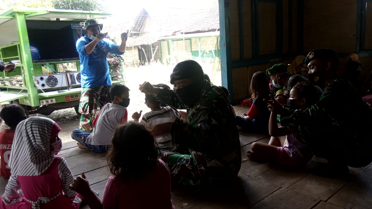 Anggota satgas mengajak anak-anak bermain dengan mendatangkan mobil Si Mokos atau perpustakaan mini berjalan.